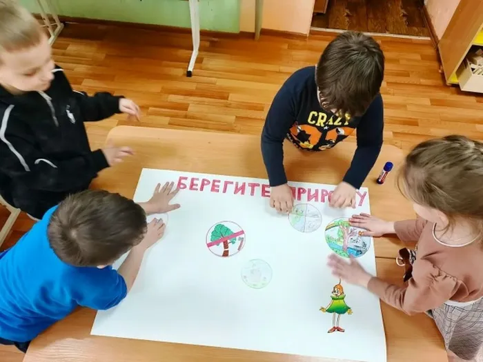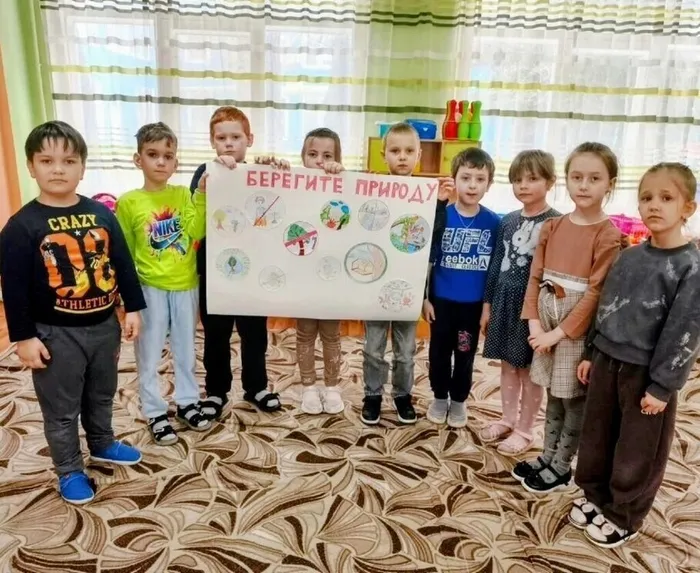 В саду совместно с воспитателем выполнили коллективную работу «Берегите природу».