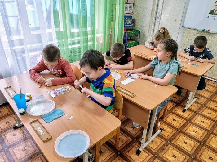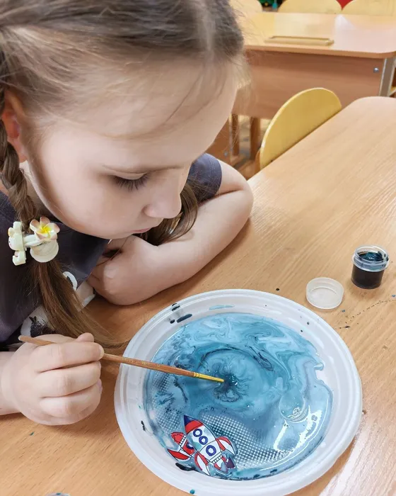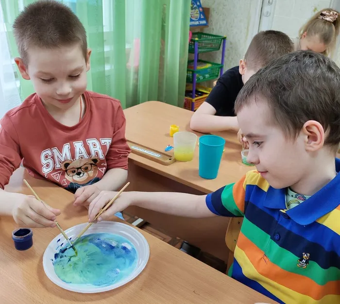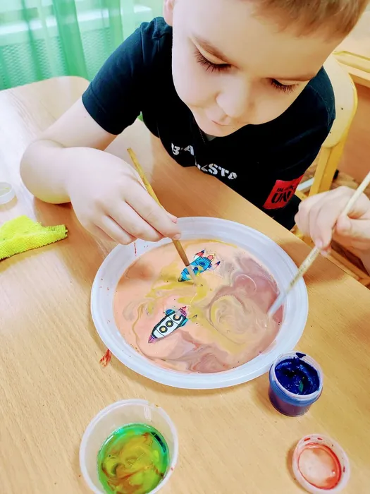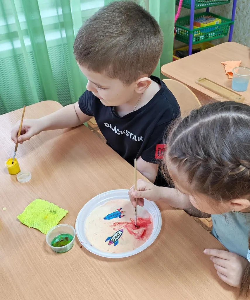 затем принялись рисовать «красками на молоке», создавая свой космос, яркий, причудливый, необычный!;